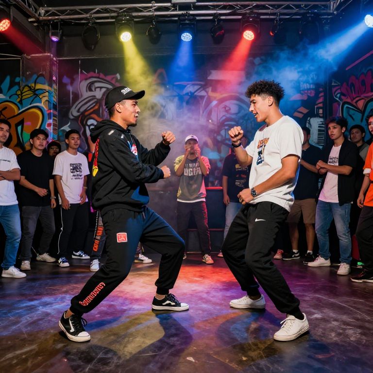Damegang performing an intense dance battle in an urban underground club, graffiti walls, colorful spotlights cutting through smoke, energetic crowd surrounding, expressive movement captured in dynamic composition, vivid streetwear detailing