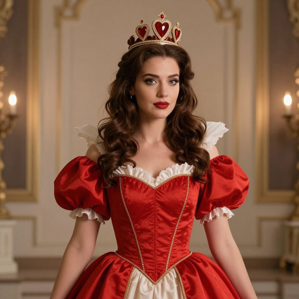 Queen Hearts, woman in a red dress with a crown on her head
