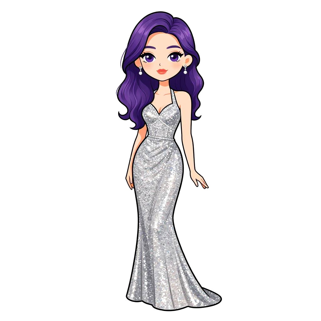 Woman with pretty face and pretty hair. smiling Woman, elegant evening wear, lace-embellished gown in silver-gray, boat neckline, long fitted sleeves, form-fitting silhouette, mermaid-style skirt with a slight flare at the hem, intricate beaded details throughout, plain white background. --sref 1467
