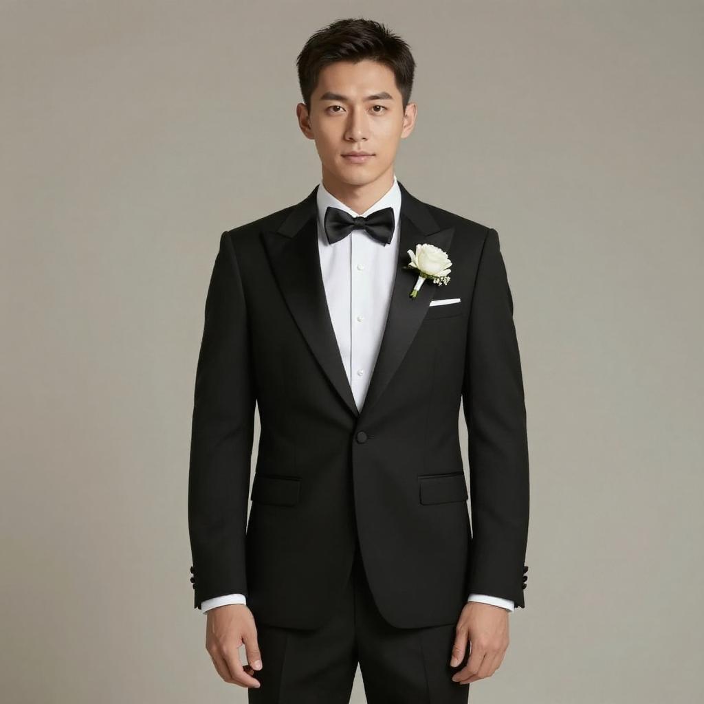 A man dressed in a classic black wedding tuxedo poses confidently against a neutral backdrop. The photorealistic portrait highlights his crisp white shirt, black bow tie, and a white boutonniere pinned to his lapel, embodying elegant formal fashion.