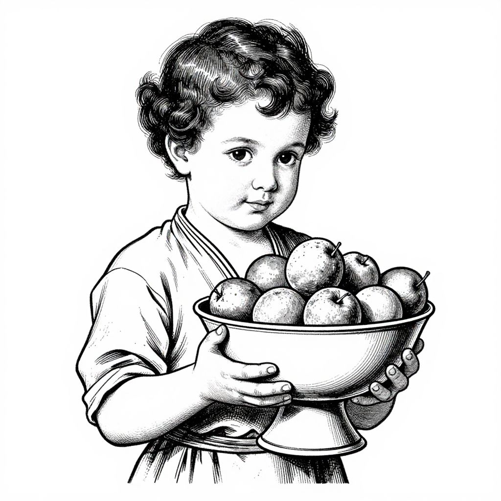 Black and white vintage-style illustration featuring a young child with curly hair wearing traditional clothing, holding a large pedestal bowl filled with round fruits. The detailed line art evokes a classic or retro aesthetic.