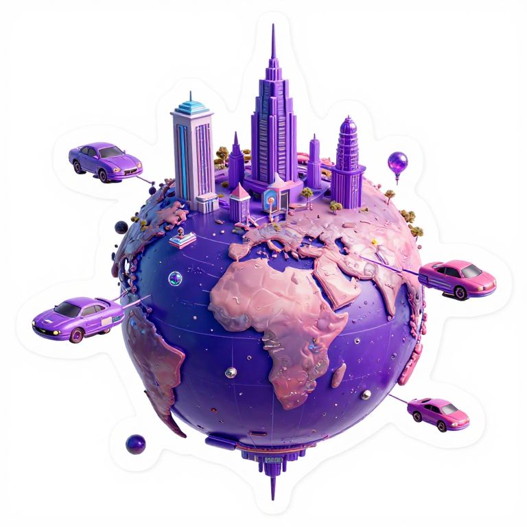 Custom Sticker a 3d digital world that shows a new undiscovered world that has advanced technology, flying ships and cars, big buildings. bright purple and pink colors, futuristic, realism, 4k,