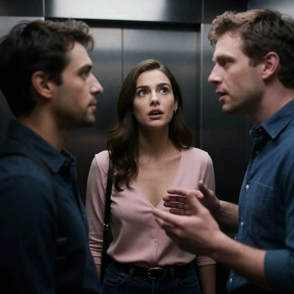 Three young adults having an intense discussion in a dimly lit elevator. A woman with long brown hair, wearing a low-cut pink top and blue jeans, looks upwards with a slightly open mouth. A man with dark hair on the left wears a dark blue shirt while looking at her, and another man with short brown hair on the right, wearing a blue button-up shirt, gestures with his hands while speaking. The setting is a metallic elevator interior.