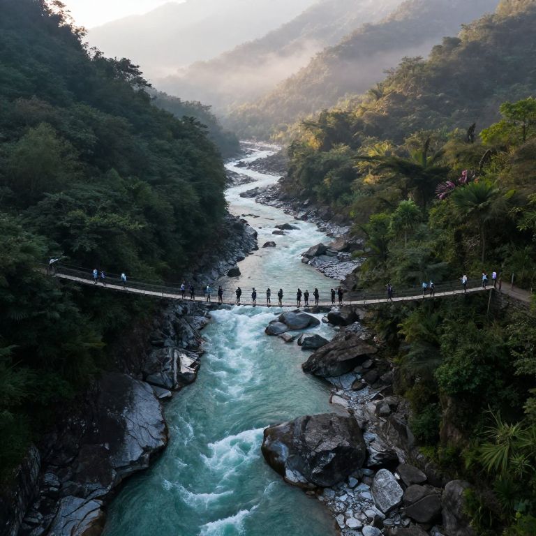 Photograph of a lush, mountainous landscape with a fast-flowing river cutting through the center. A narrow suspension bridge spans the river, with several small, silhouetted figures walking across. The river, with white-capped waves, flows between dark, rocky banks and is surrounded by dense greenery. Tall trees and shrubs line the riverbanks, with sunlight filtering through the misty, cloud-covered sky in the background. The overall atmosphere is serene yet adventurous, with the bridge adding a sense of human interaction with nature.