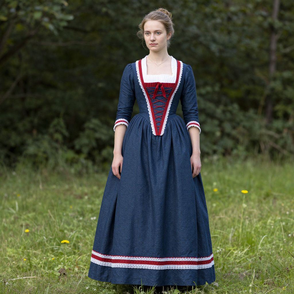 Photograph of a young woman with light skin and brown hair in a dark blue, long-sleeve, traditional dress with white and red trim,
