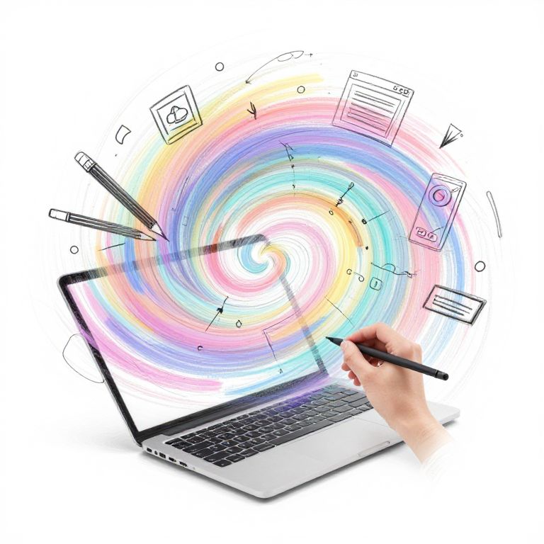Clipart maker concept showing a creative artist sketching digital icons on a tablet, stylus pen in hand, floating colorful clipart icons around, modern digital art studio environment, warm lighting and vivid hues highlighting a productive design process