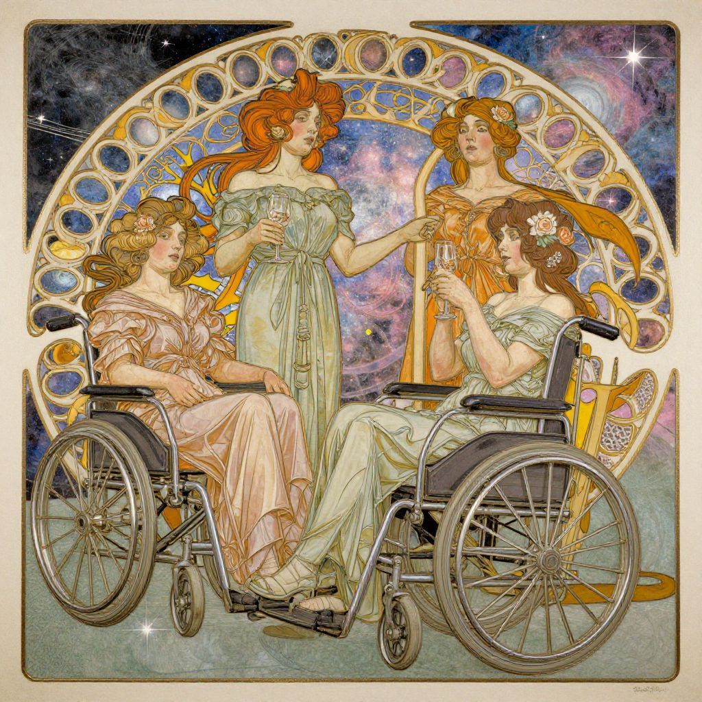 Art Nouveau decoupage group of women wheel chairs galaxy background surrealism abstract intricate details highly defined V 5,