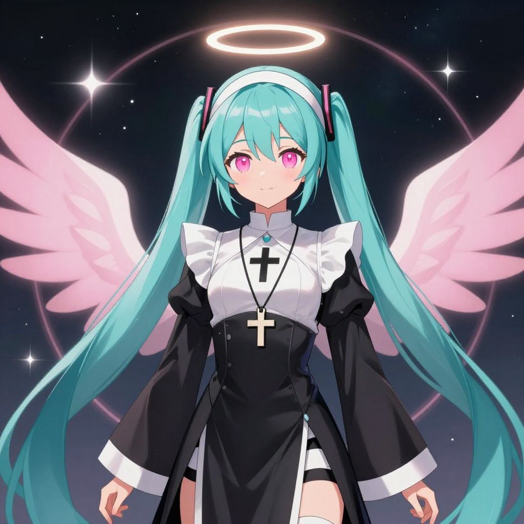 Digital anime-style illustration of a nun character inspired by Vocaloid aesthetics. The girl has long, aqua-colored twin tails, pink eyes, and wears a black and white nun's habit with a cross necklace. She is depicted with a glowing halo above her head and ethereal pink wings behind her. The background is a dark starry sky with radiant circular light patterns.