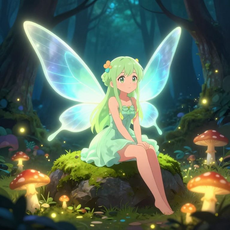 Fairy girl anime perched on a mossy stone in an enchanted forest clearing, her vibrant wings glowing with bioluminescence, surrounded by glowing mushrooms and fireflies, expressive anime eyes and soft pastel colors, beautifully detailed background with fantasy elements