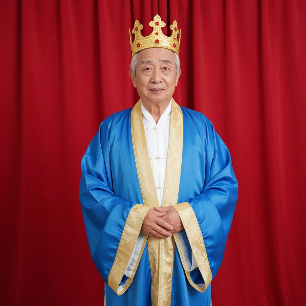 Photograph of an older Asian man with gray hair wearing a gold crown adorned with red jewels, a royal blue robe with gold trim, and a white shirt. He stands against a vibrant red curtain, hands clasped in front. His expression is calm and dignified. The rich colors and textures of the robe and curtain contrast with his skin tone, adding to the regal appearance. The image emphasizes his status and authority.