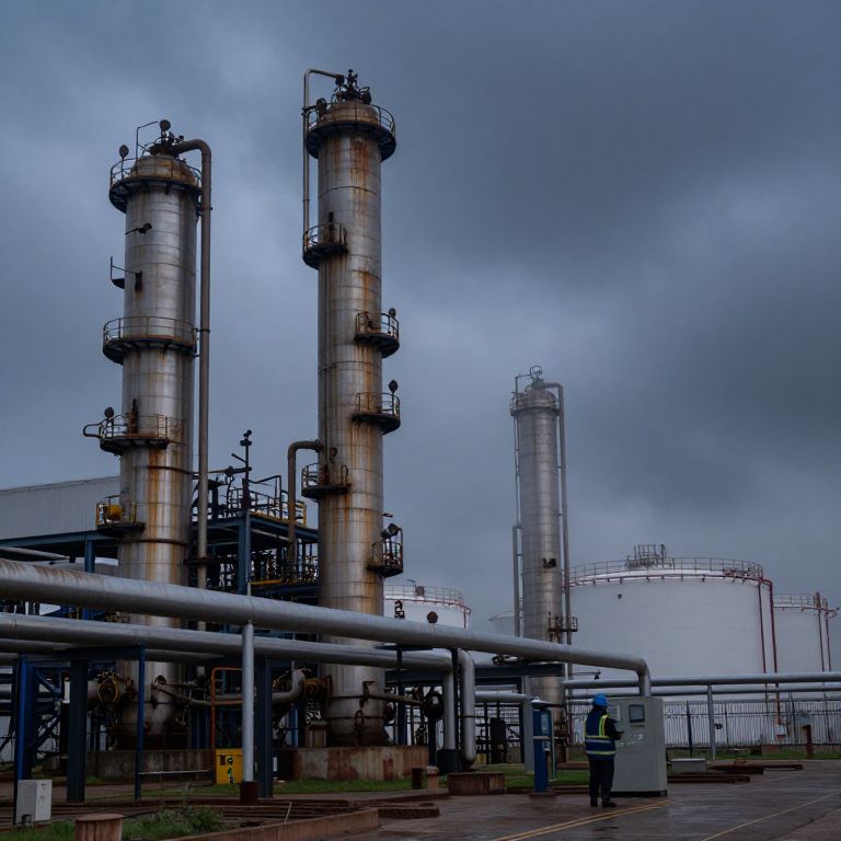 Photograph of industrial refinery with two tall, rusted steel towers, cloudy blue-gray sky, complex piping, and a distant white storage tank.