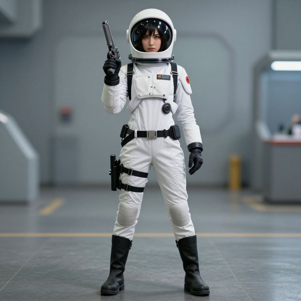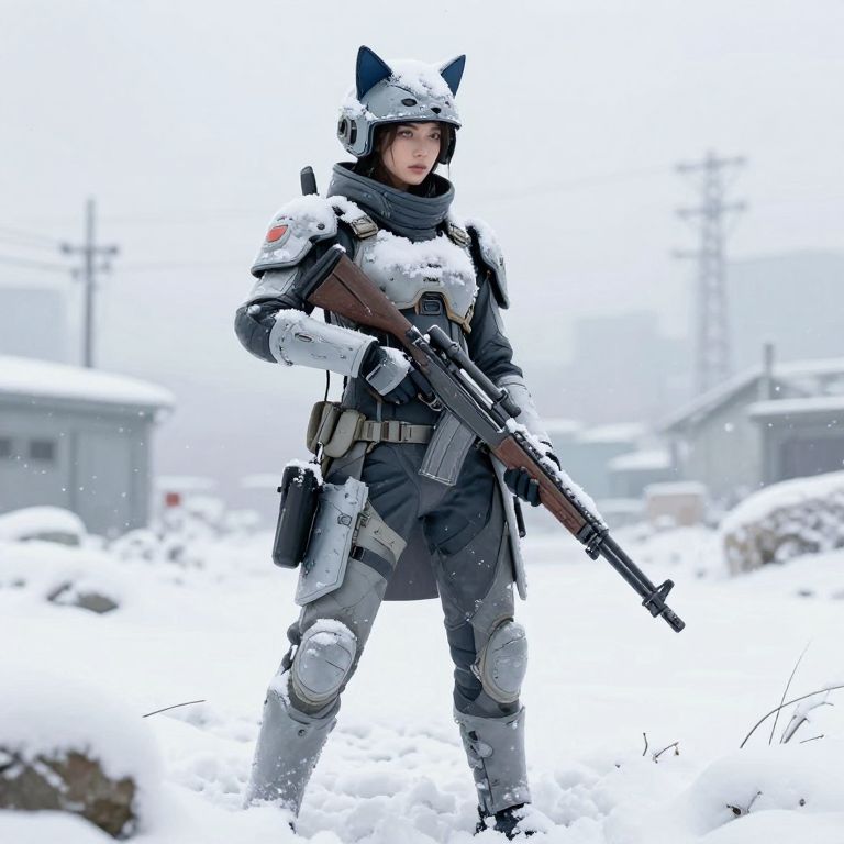 Digital artwork of a female soldier in snow-covered winter landscape, wearing white cat-ear helmet, black tactical gear, holding rifle, snowflakes falling
