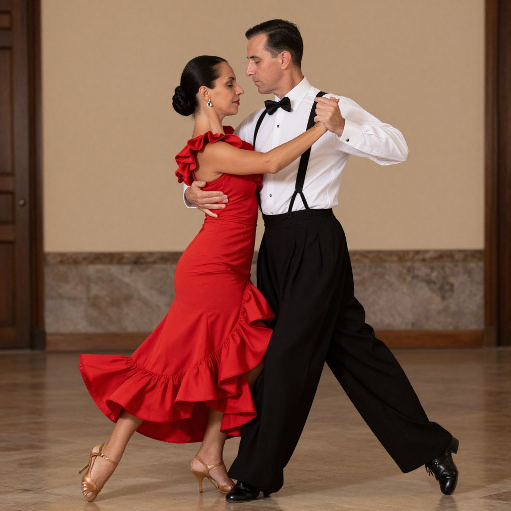 Pair of adults dressed in vibrant Spanish-inspired costumes, featuring a woman in a flowing red dress with ruffled details and a man in a classic white shirt, black bow tie, suspenders, and wide-legged trousers, poised as if ready to dance the tango.