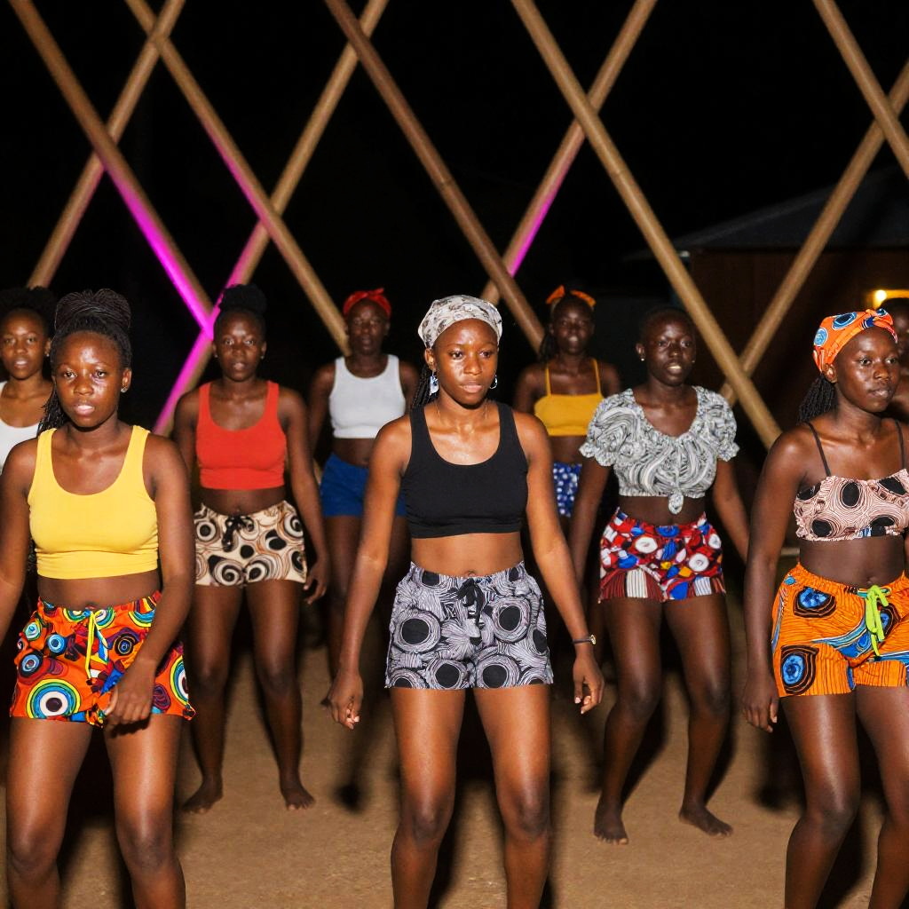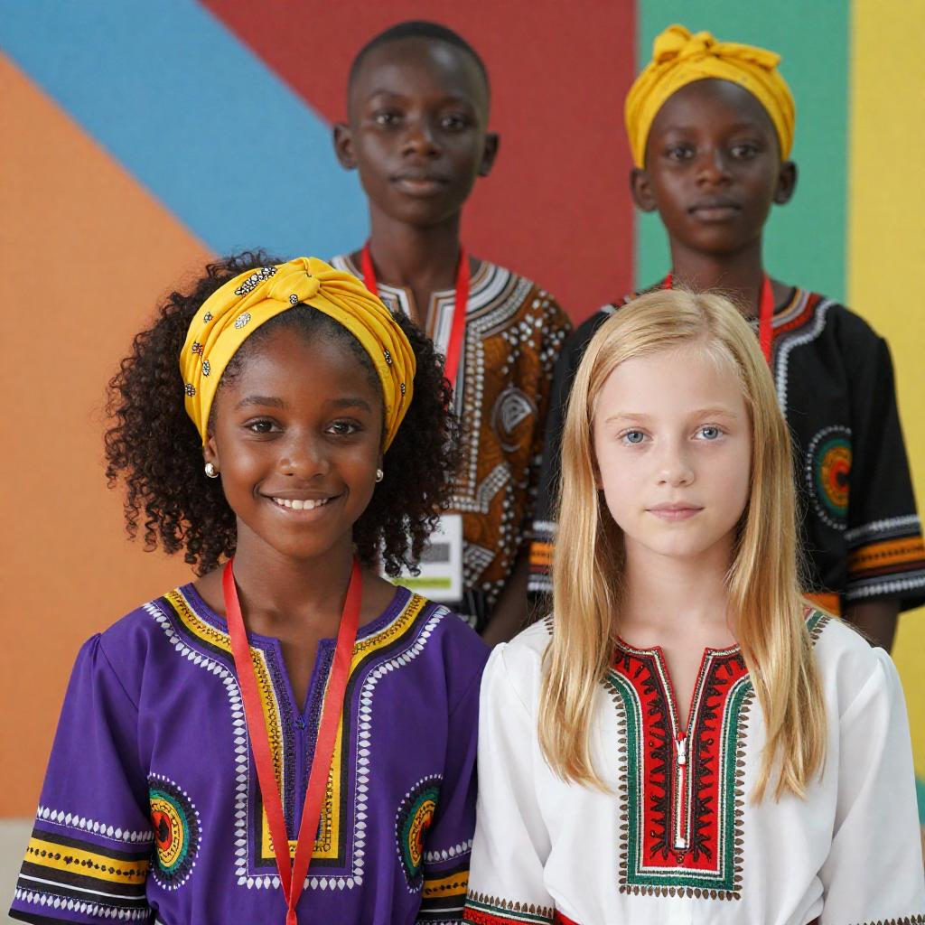 Photograph of four children in colorful traditional attire. Two girls in front, one with curly hair in a yellow headwrap and purple-patterned dress, the other with straight blonde hair in a white blouse with red and green patterns. Two boys behind, one in a patterned brown shirt with a red lanyard, the other in a yellow headwrap and patterned black shirt. Background with colorful geometric shapes. The curly-haired girl smiles, while the blonde girl has a neutral expression.