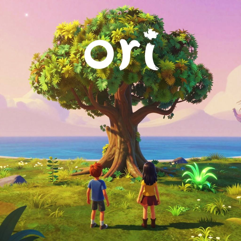 Digital illustration of two children standing before a large, leafy tree with "Oru" written above it, overlooking a vibrant, colorful beach landscape.