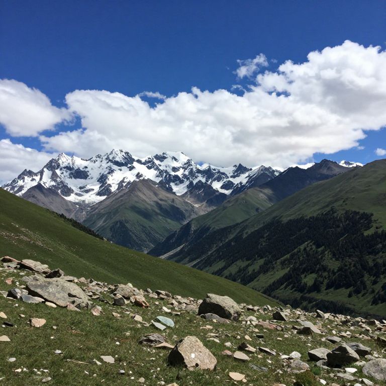 Photograph of a mountainous landscape under a bright blue sky with scattered white clouds. Snow-capped peaks dominate the background, while mid-ground features dark green, forested slopes. The foreground displays a rocky, grassy terrain with scattered boulders. The image captures the contrast between the sharp, rugged rocks and the lush, green grass, highlighting the natural beauty of the mountains. The snow on the peaks gleams under the sunlight, adding a crisp, white element to the scene.