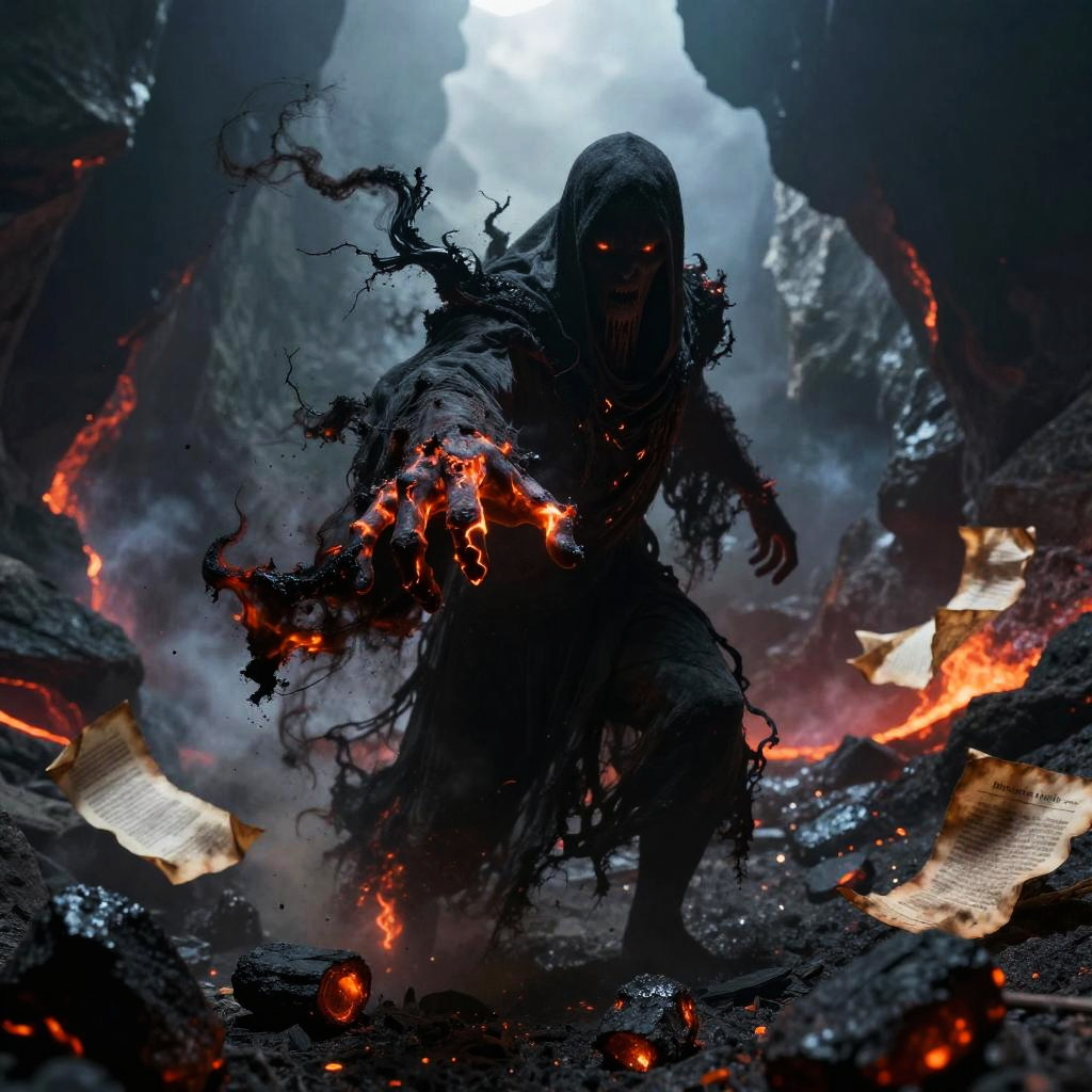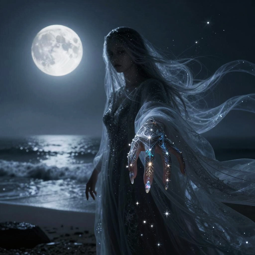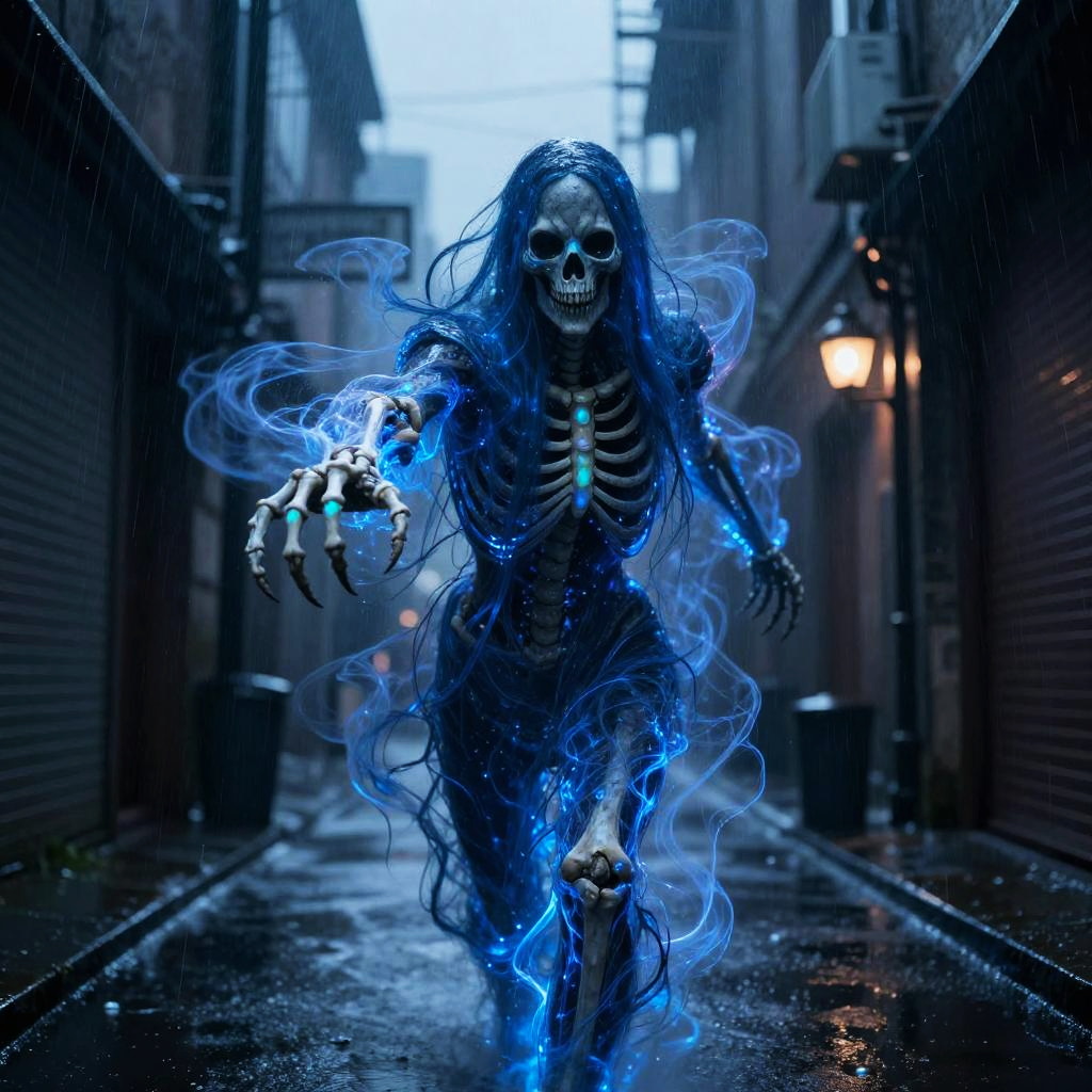 A spectral wraith with moth-wing membranous fingers dusted with luminescent pollen reaching forward, its form dissolving into a cascade of bioluminescent moth-scales and drifting pollen, moving through a overgrown glass conservatory bathed in phosphorescent twilight.