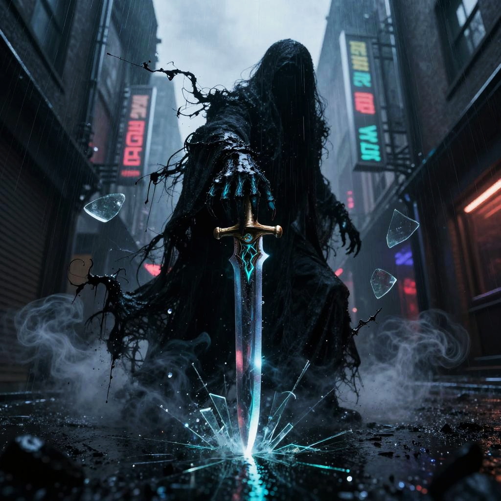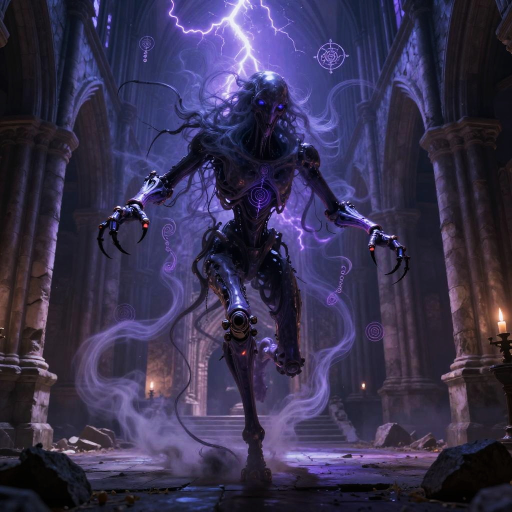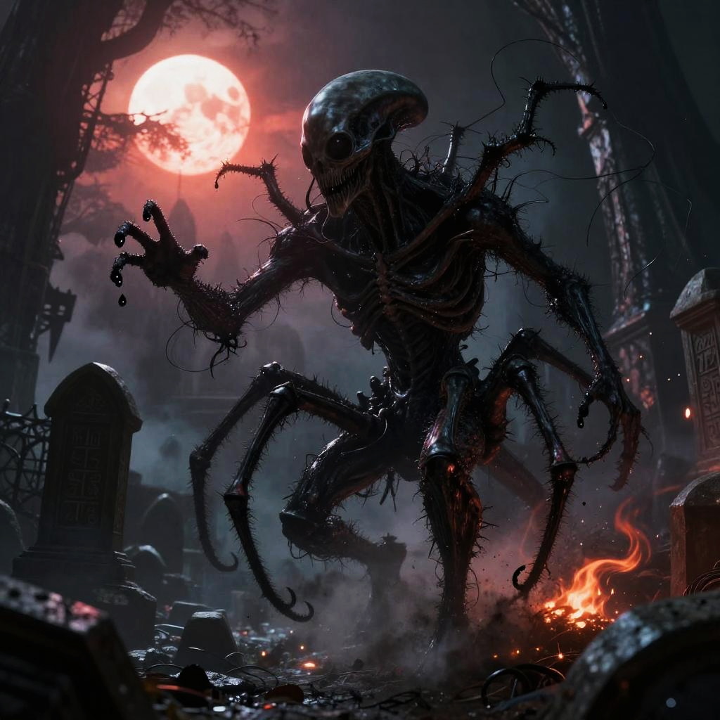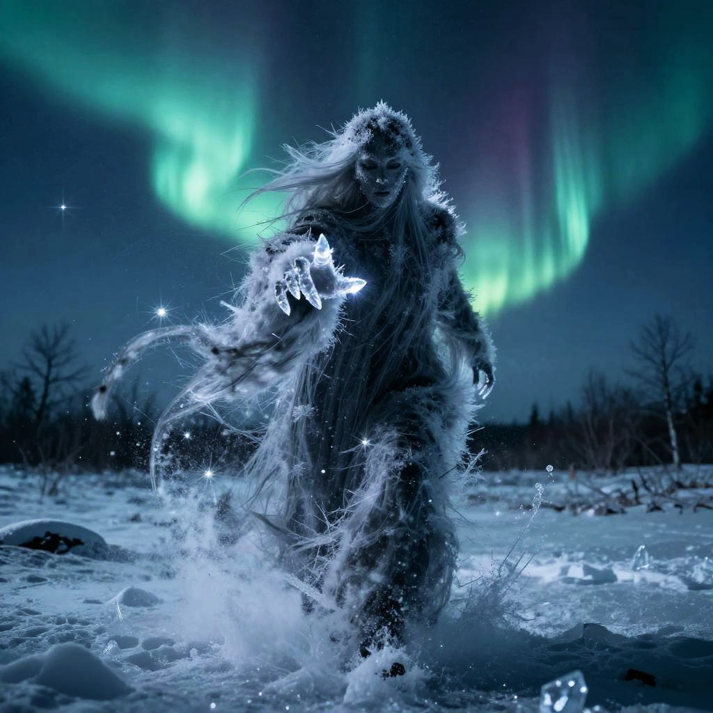 A spectral wraith with moth-wing membranous fingers dusted with luminescent pollen reaching forward, its form dissolving into a cascade of bioluminescent moth-scales and drifting pollen, moving through a overgrown glass conservatory bathed in phosphorescent twilight.