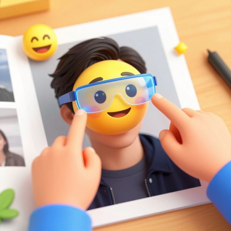 A colorful CGI image shows a pair of hands holding a photograph of a smiling emoji with short black hair and blue transparent glasses. The emoji's face is centered on the photo, which is placed on a wooden table. In the background, a yellow smiley face emoji is slightly blurred. To the right, a black pen is visible. The hands, wearing blue sleeves, are positioned on the emoji's glasses, adjusting them. The photo shows the emoji wearing a dark blue hoodie. The image has a playful, cartoonish style with bright colors and smooth textures.