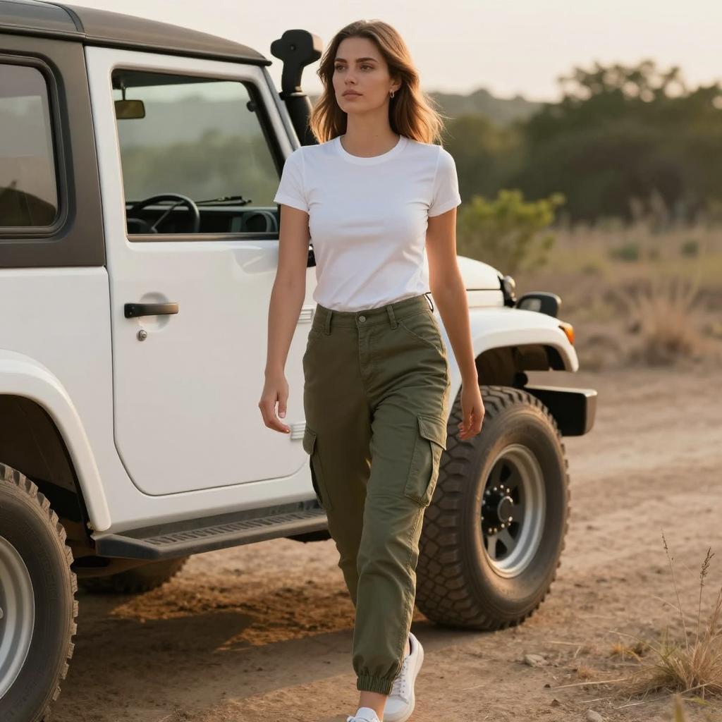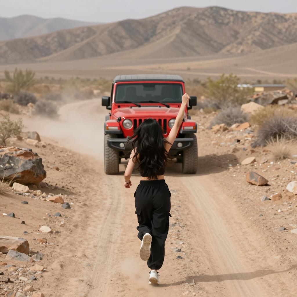 Photograph of a desert landscape. Woman with long black hair, topless, wearing black pants, runs forward with arm raised. Red Jeep with black roof, centered in background, drives up a dirt path. Rocky terrain, sparse vegetation, hills in background.