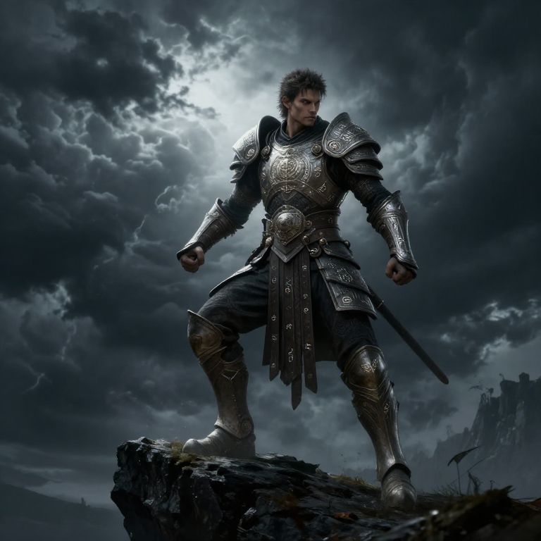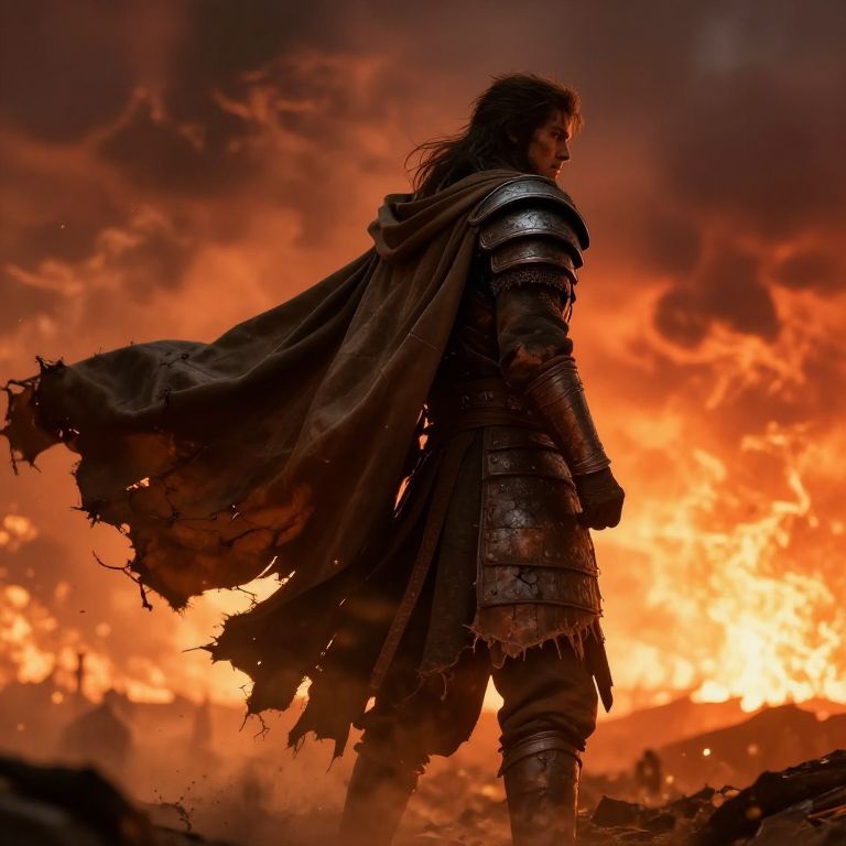 A dramatic photograph depicts a muscular, dark-haired warrior in full, tattered medieval armor standing in profile against a backdrop of intense, orange flames and dark, smoky clouds. His long, flowing cape billows behind him, revealing worn, frayed edges. The warrior's armor is intricately detailed, with metallic plates on the shoulders and chest, and he wears heavy, dark boots. The fiery sky contrasts with his shadowy silhouette, creating a powerful, heroic visual. The image evokes a sense of strength and determination amidst chaos.