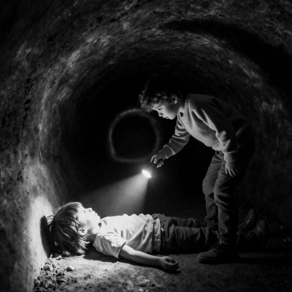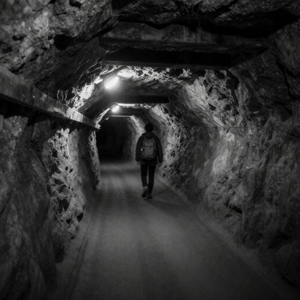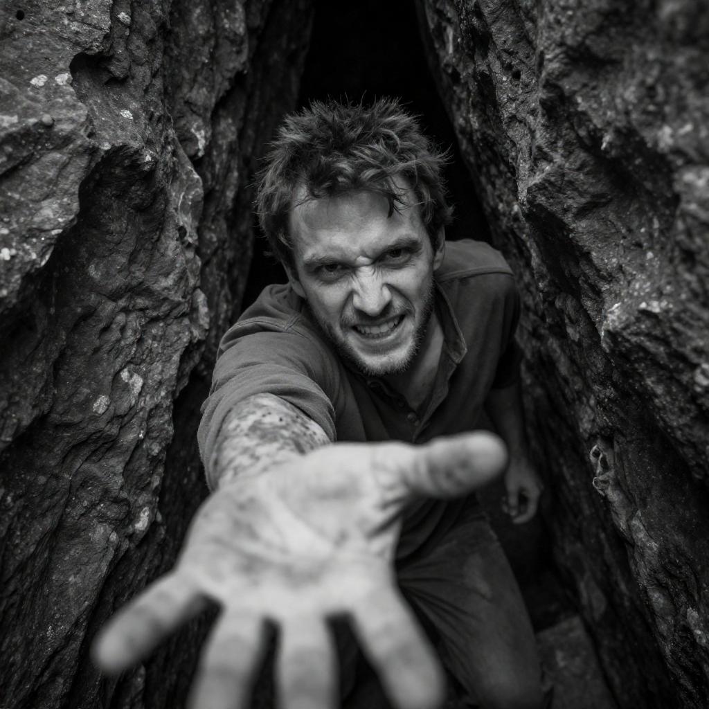 Black-and-white photograph of a man with tousled dark hair, grimacing as he reaches forward from a dark, rocky cave. His right hand, covered in dirt, extends towards the viewer. The rough ure of the cave walls contrasts with his slightly disheveled appearance. The man's expression conveys determination and struggle.