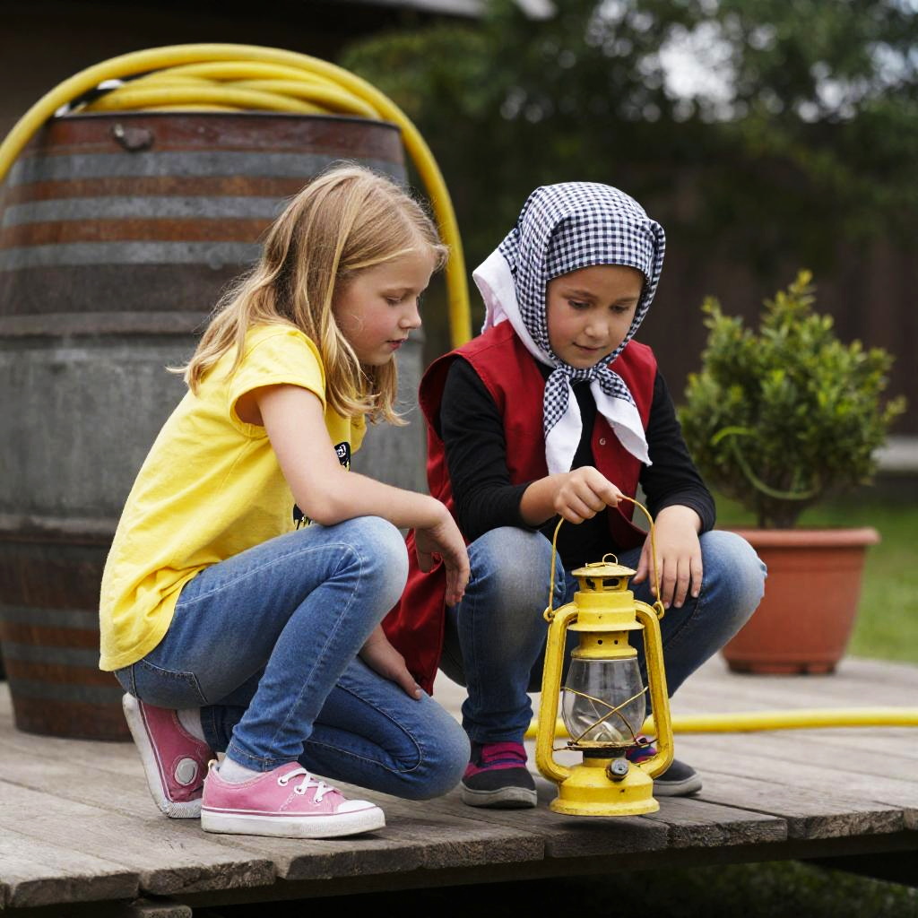Photograph of a young boy with light skin and dark hair, wearing a pink shirt, brown pants, and a gray hat, climbing a wooden ladder inside a rustic, dark wooden hut. The background includes a red, patterned cloth on the left. The boy's expression is focused, and his right hand grips the ladder above him.