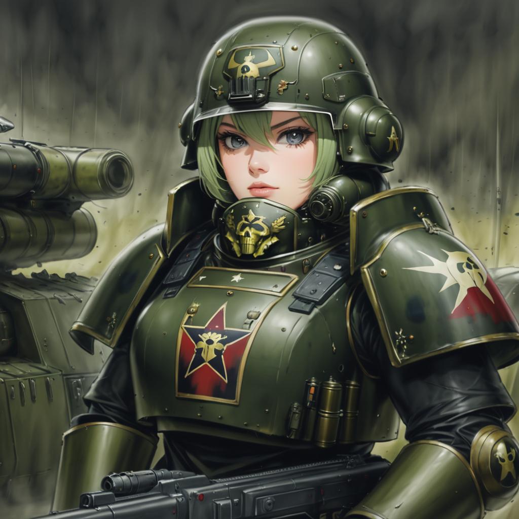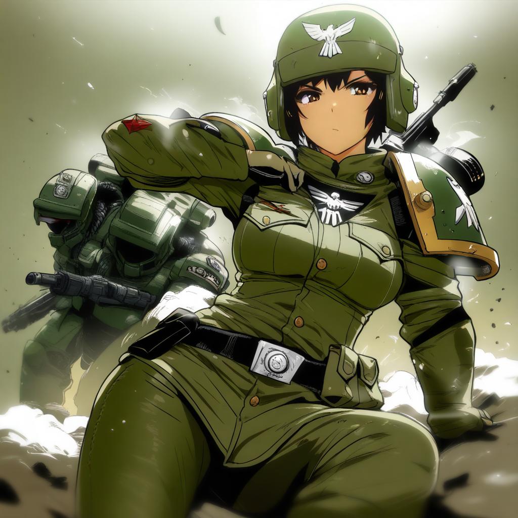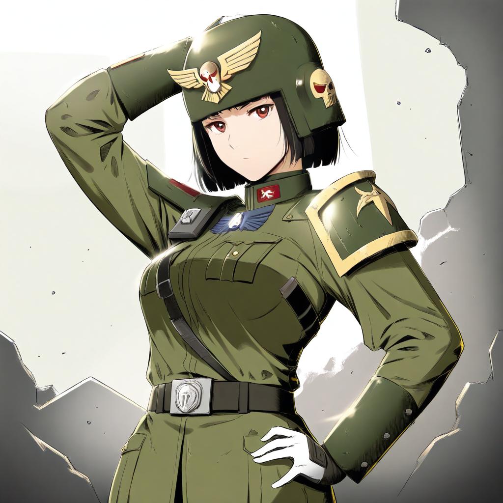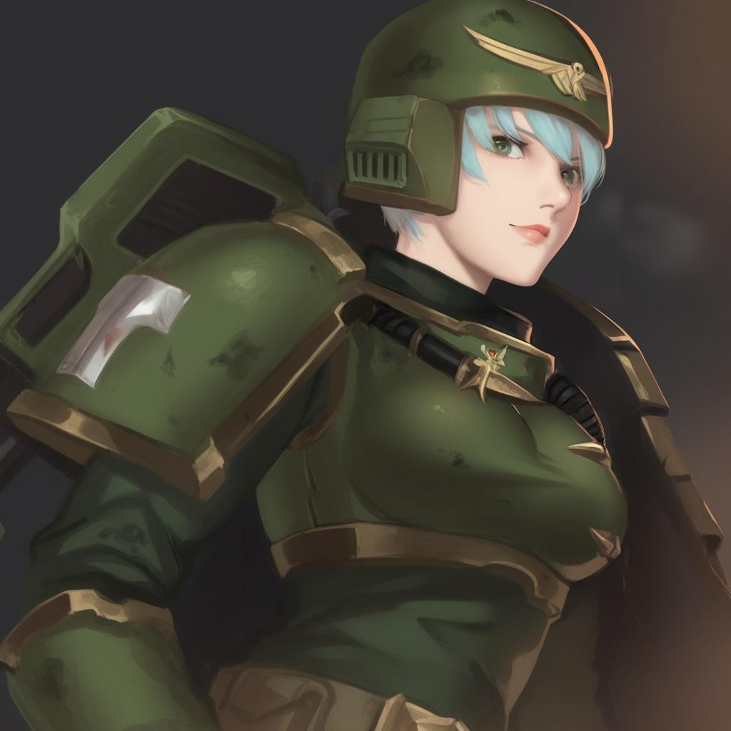 Astra militarum, warhammer 40k, 1girl, short hair, medium breasts, military uniform, armor, helmet, military uniform, by artist swkl:d, leet
