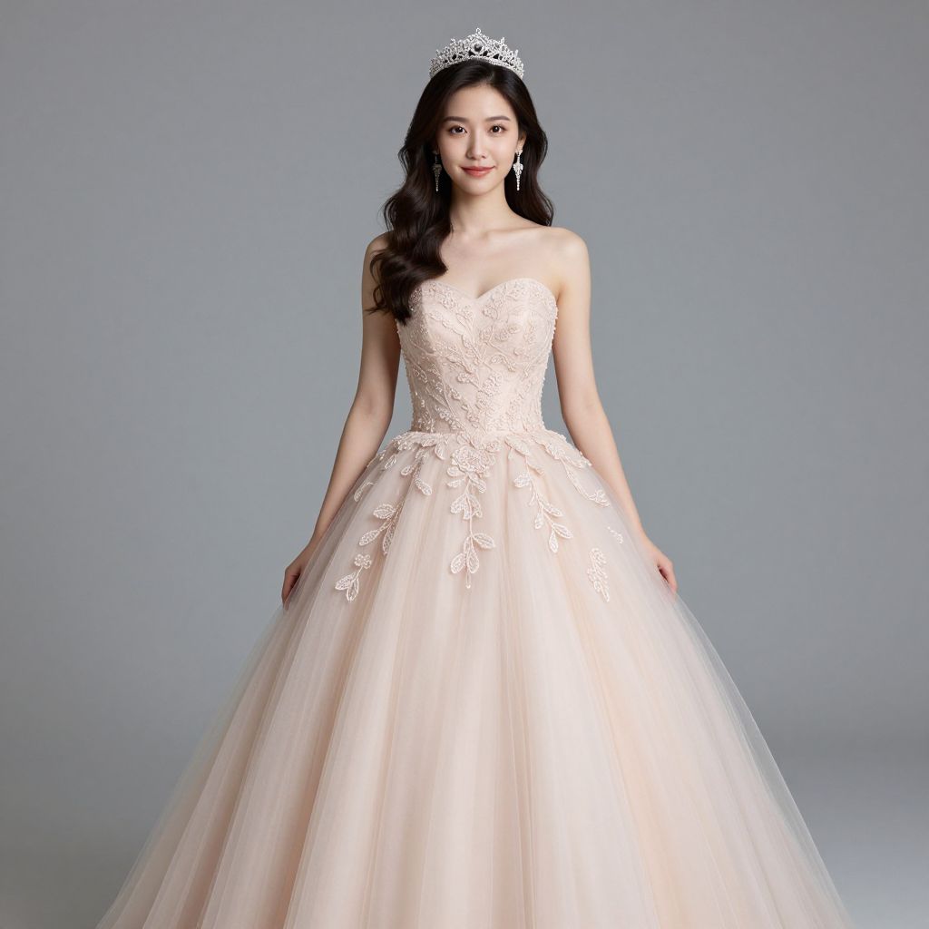 Radiant young woman wearing a strapless, blush-pink Sweet 16 dress with intricate floral beadwork on the bodice, complemented by a voluminous tulle skirt, accessorized with a sparkling tiara and dangling earrings, standing gracefully against a neutral gray backdrop.