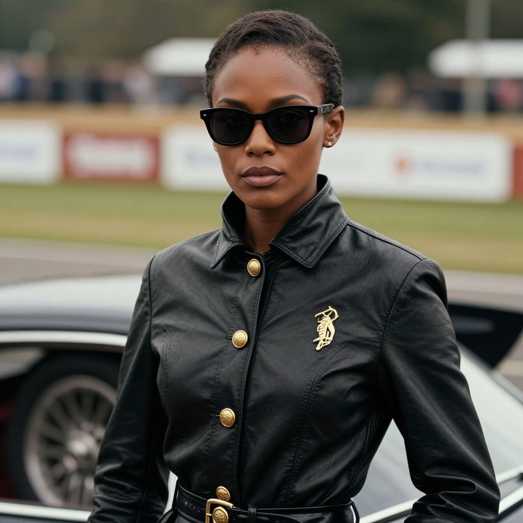 The image depicts a hyper-realistic, cinematic portrait of a beautiful woman with an African American heritage, exuding a sense of elegance and sophistication. She is wearing a stylish, black leather jacket with gold accents, which adds a touch of luxury and refinement to her appearance. The jacket features a high collar and a buttoned front, with a gold emblem on the left side, suggesting a high-end fashion brand. The woman's hair is neatly pulled back, adding to her polished look. She is wearing dark sunglasses, which enhance her mysterious and confident demeanor. The background is a blurred, cinematic setting, likely a car race, with a sleek, black car partially visible, hinting at the Goodwood car race theme. The overall composition is directed by Wes Anderson, characterized by its hyper-detailed and photorealistic quality, capturing the essence of Ralph Lauren style. The image is a perfect blend of fashion and automotive culture, creating a visually striking and dynamic scene.