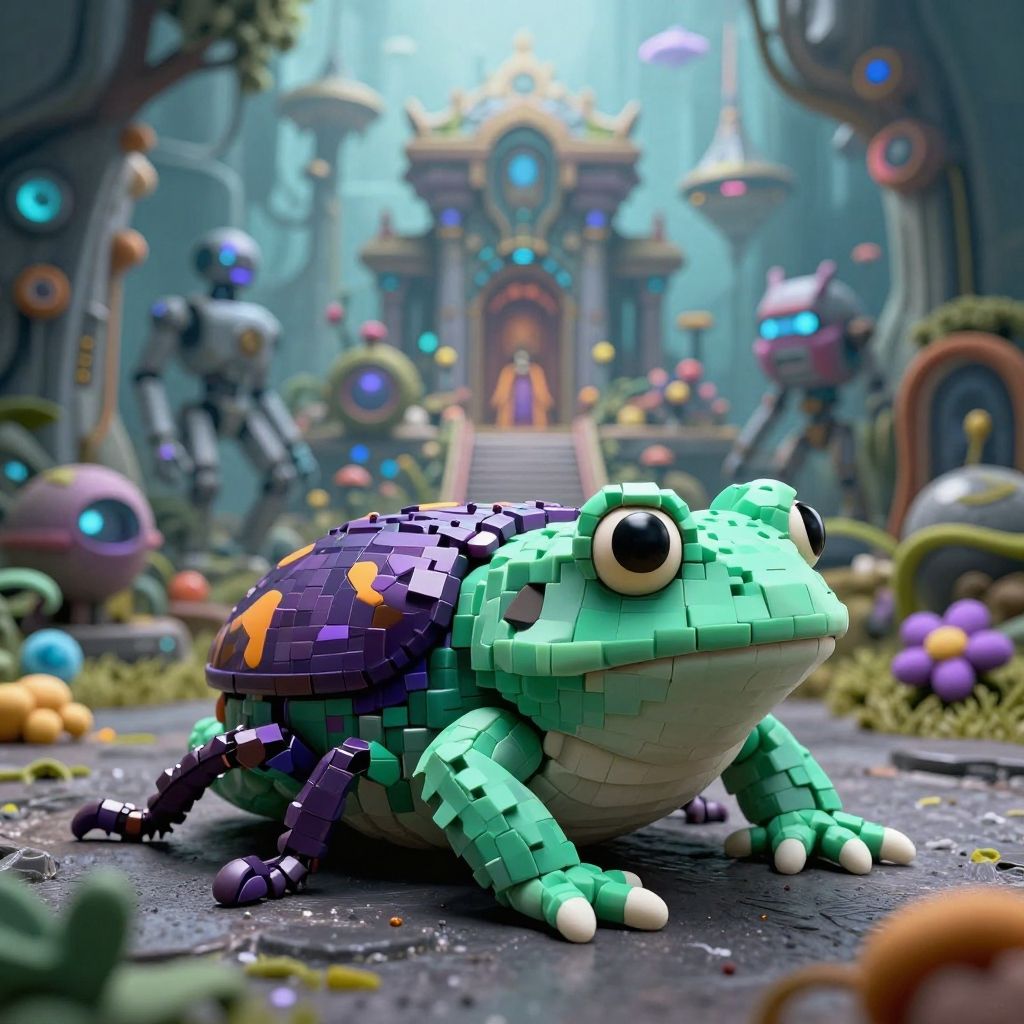 Extremly detailed (background), (focus background), (UHD:1.1) high quality perfects lighting (detailed background visible:1.2)(Style: subsurface scattering (pui) analog style realistic film photography highres photo cinematic Lighting trending on artstation)(Photorealistic:1.2)(detailed) sharp HDR high quality good resolution maximalist masterpiecedetailed Canon EOS 90D with Canon EF-S 18-135mm f-3.5-5.6 IS USM photograph of Squash BeetleFire-Bellied Toad VoxelPlay-Doh (color scheme: jadeamethystgreen) in ((A kingdom ruled by intelligent machines that have replaced organic lifeforms creating a cybernetic utopia)) awe mouth open eyes open disbeliev opulent