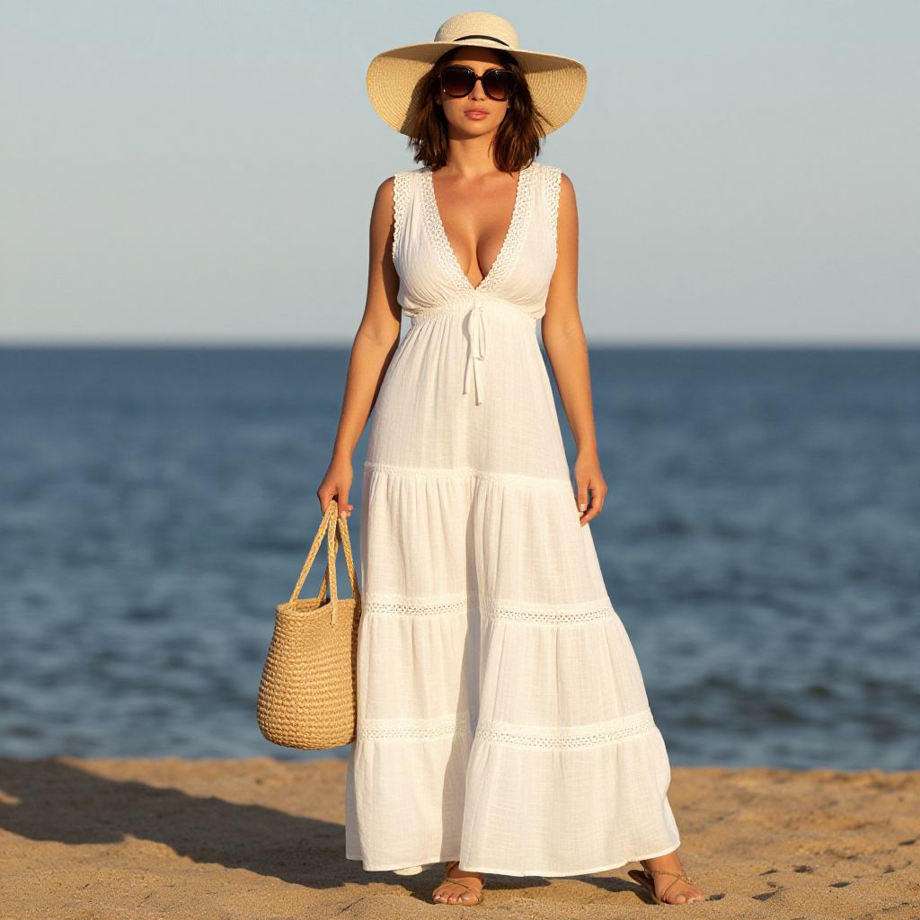 Photograph of a woman standing on a sandy beach with a calm blue ocean in the background. She has light brown skin, shoulder-length dark brown hair, and is wearing dark sunglasses. She is dressed in a sleeveless, white, deep V-neck dress with lace detailing and a wide-brimmed straw hat. She holds a large, woven straw tote bag in her right hand and stands barefoot in the sand. The sunlight casts a warm glow, highlighting the texture of the dress and her relaxed, confident pose. The sky is clear and blue.