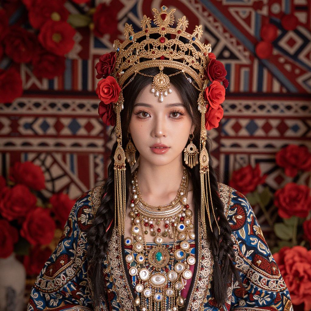 Photograph of an Asian woman with fair skin and long black hair, wearing an ornate gold crown adorned with red roses. She has large, gold, hanging earrings and a detailed, multi-layered necklace with turquoise and red gemstones. Her traditional, embroidered blue and gold robe is decorated with intricate patterns. The background features a vibrant, geometric textile with red and blue colors, and a cluster of red roses. Her expression is calm and composed, with subtle makeup highlighting her eyes and lips. The image has a rich, cultural, and regal aesthetic.