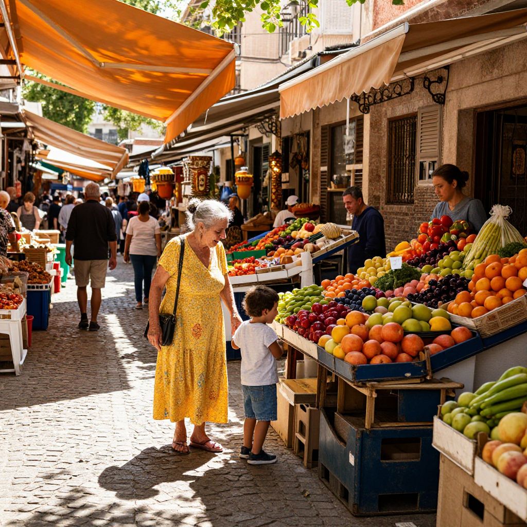 Sunlit cobblestone streets wind through a vibrant marketplace, where orange awnings cast dappled shadows over tables laden with colorful produce, while an elderly woman in a yellow dress holds hands with a child, guiding them past stalls bustling with life and laughter.