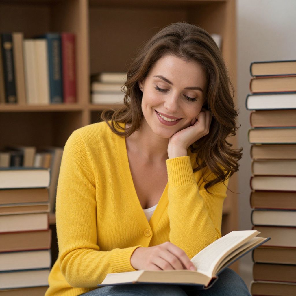 Radiant serenity and timeless wisdom shine through the warm embrace of knowledge, as a smiling woman in a vibrant yellow cardigan sits amidst the comforting hum of books and the soft scent of paper, embodying the enduring spirit of learning and connection.
