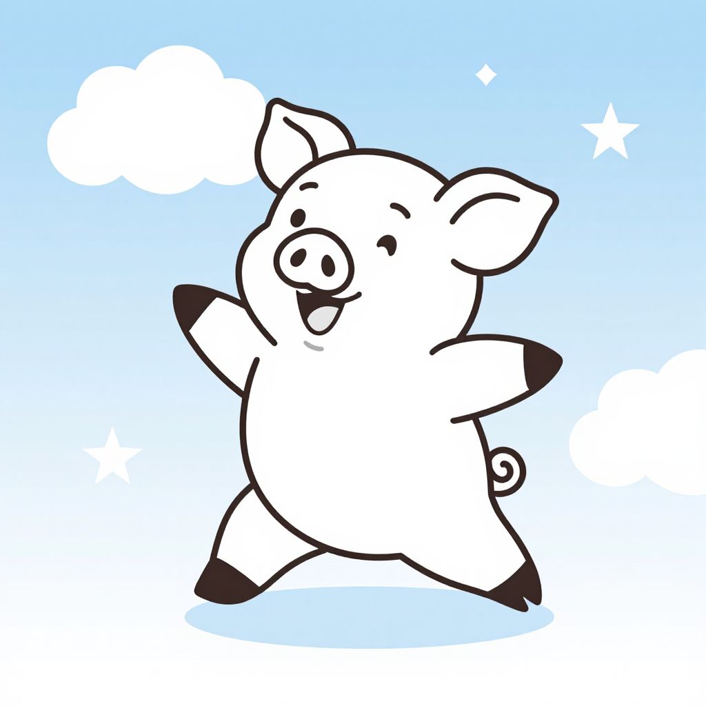 Digital drawing of a cute, cartoon-style pig with a round body, small tail, and large ears. The pig is smiling with its mouth open, and has black-tipped ears, feet, and a small curly tail. It is mid-leap with arms raised, set against a light blue background with white clouds and small stars. The pig is outlined in black, creating a simple and playful aesthetic. The overall style is whimsical and child-friendly.