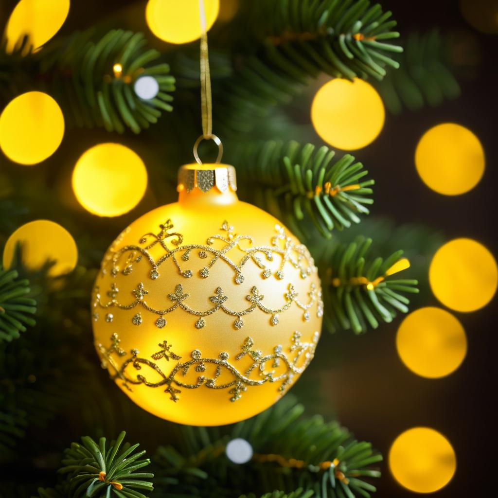 Close-up view of a yellow Christmas bauble decorated with silver glitter patterns, hanging on a green pine tree branch. The background features soft-focused yellow and blue holiday lights, creating a warm, festive ambiance.