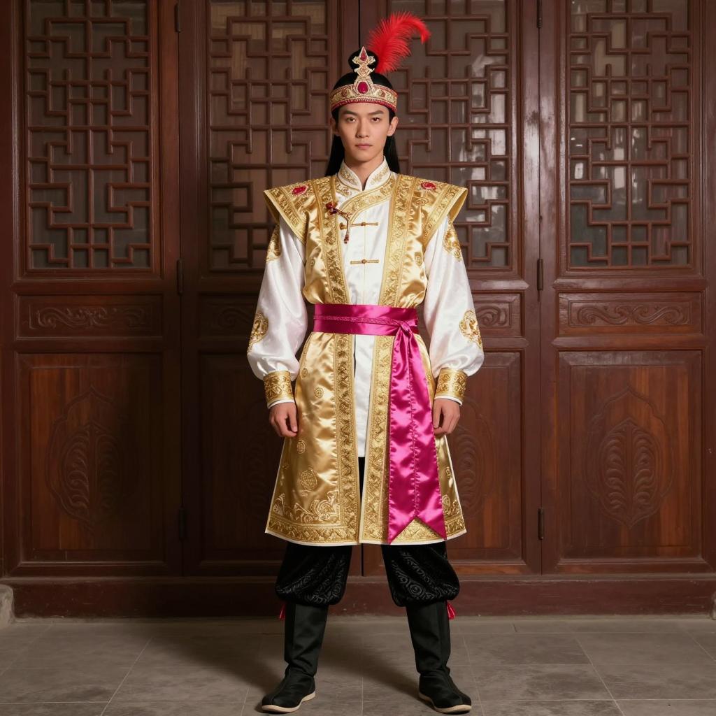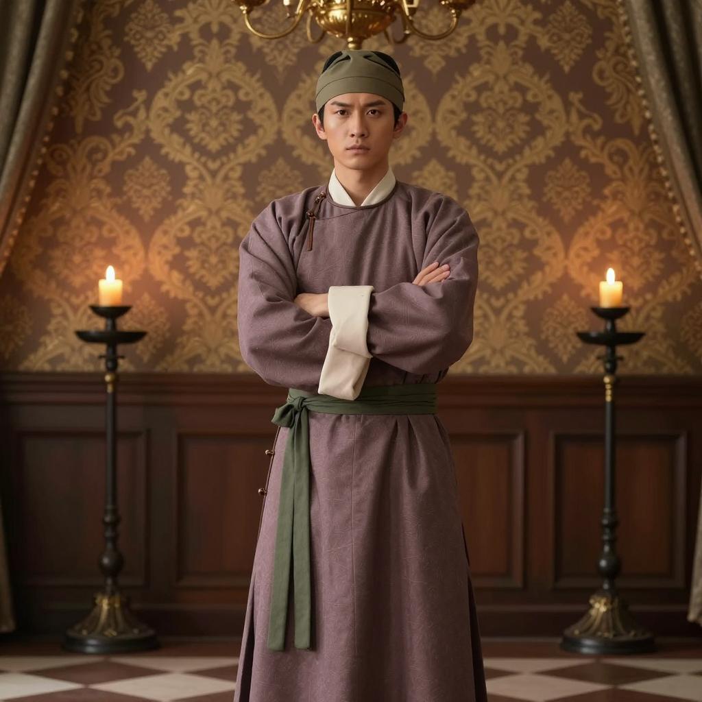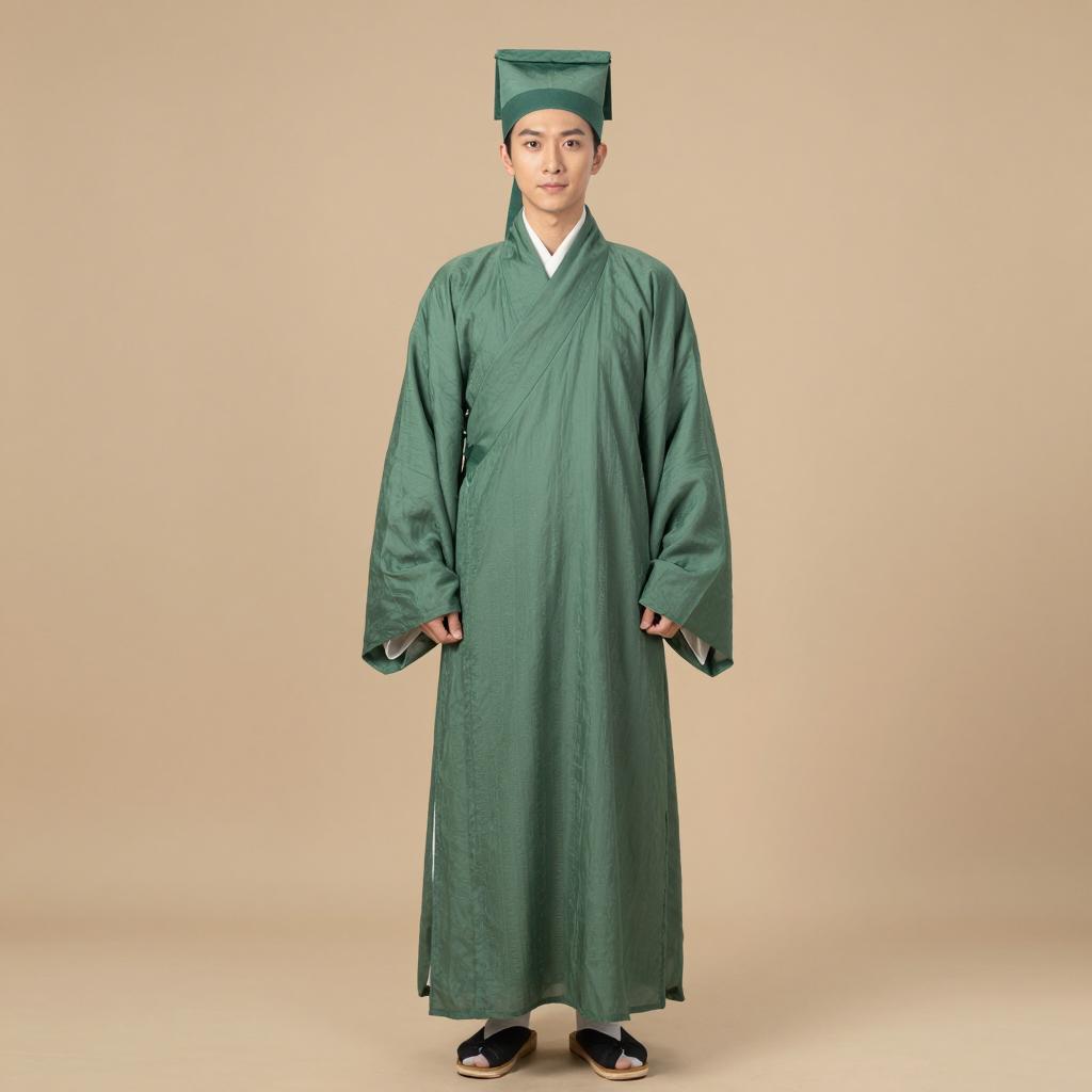 Green lyrical costume, photograph of Asian man, standing, full body, wearing traditional green Chinese robe, green headpiece, braided hair, tan background, plain backdrop, standing on wooden sandals, neutral expression, hands at sides, robe with wide sleeves, loose-fitting, simple lighting, minimal shadows, realistic style