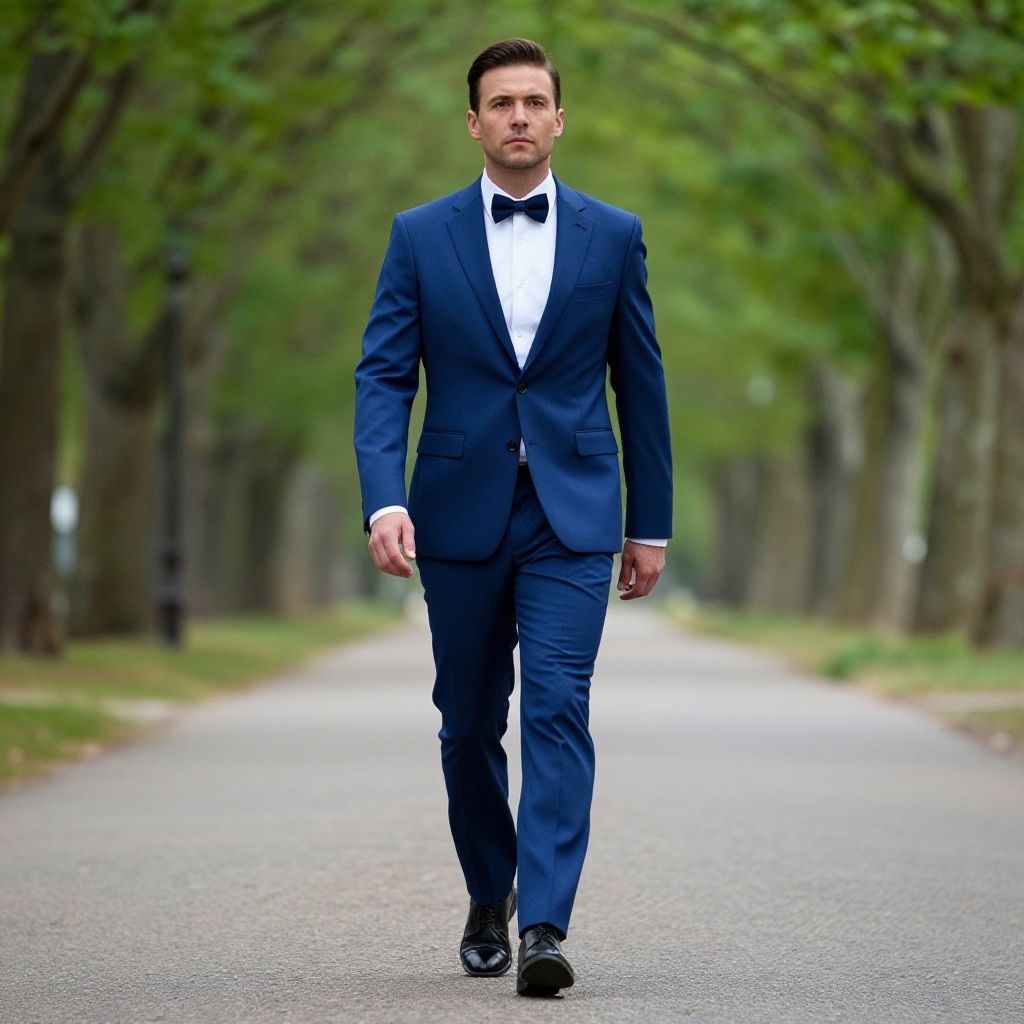 An artistic depiction of a confident man dressed in a sharp blue suit with a bow tie, walking purposefully down a serene tree-lined path.
