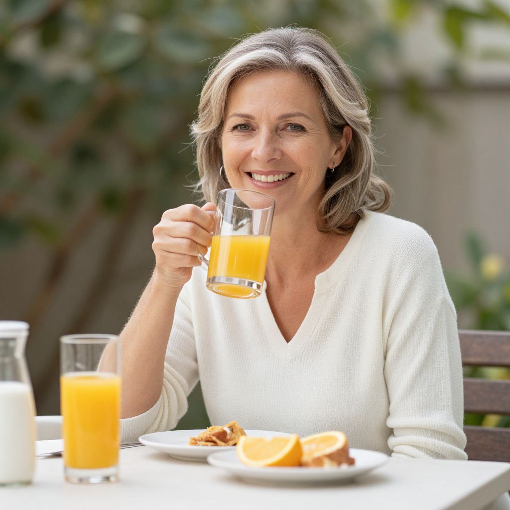 Photograph of a smiling middle-aged woman with shoulder-length, silver-blonde hair, wearing a light gray, textured sweater. She's seated outdoors at a white table, holding a glass of bright orange juice in her right hand and resting her chin on her left hand. On the table are two whole oranges and an orange slice. In the blurred background, there's green foliage and a white vase with small white flowers. The image has a vibrant, natural color palette with a soft focus effect, enhancing the cheerful and relaxed atmosphere.