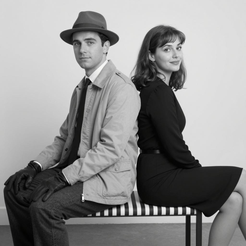 Black and white photograph of a man and woman sitting back-to-back on a striped bench. Man wears a hat, light jacket, dark tie, and gloves, looking forward. Woman in a dark dress and knee-length skirt, smiling slightly, looking to the right. Man's left hand rests on his knee, woman's right hand touches his shoulder. Simple, light-colored background. Both seated with legs extended.