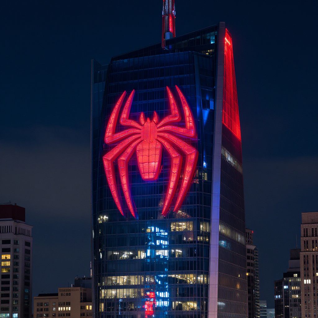 Photograph of a tall skyscraper at night, featuring a large, illuminated red spider logo on its glass facade. The spider's glowing red lights contrast with the dark blue and black sky. The building has red and blue neon accents on its corners. Surrounding buildings are partially visible, with some lights on, creating a cityscape backdrop. The spider logo is centered, occupying most of the middle section of the building's face. The image has a modern, urban feel with sharp, vibrant colors and clear, crisp details.