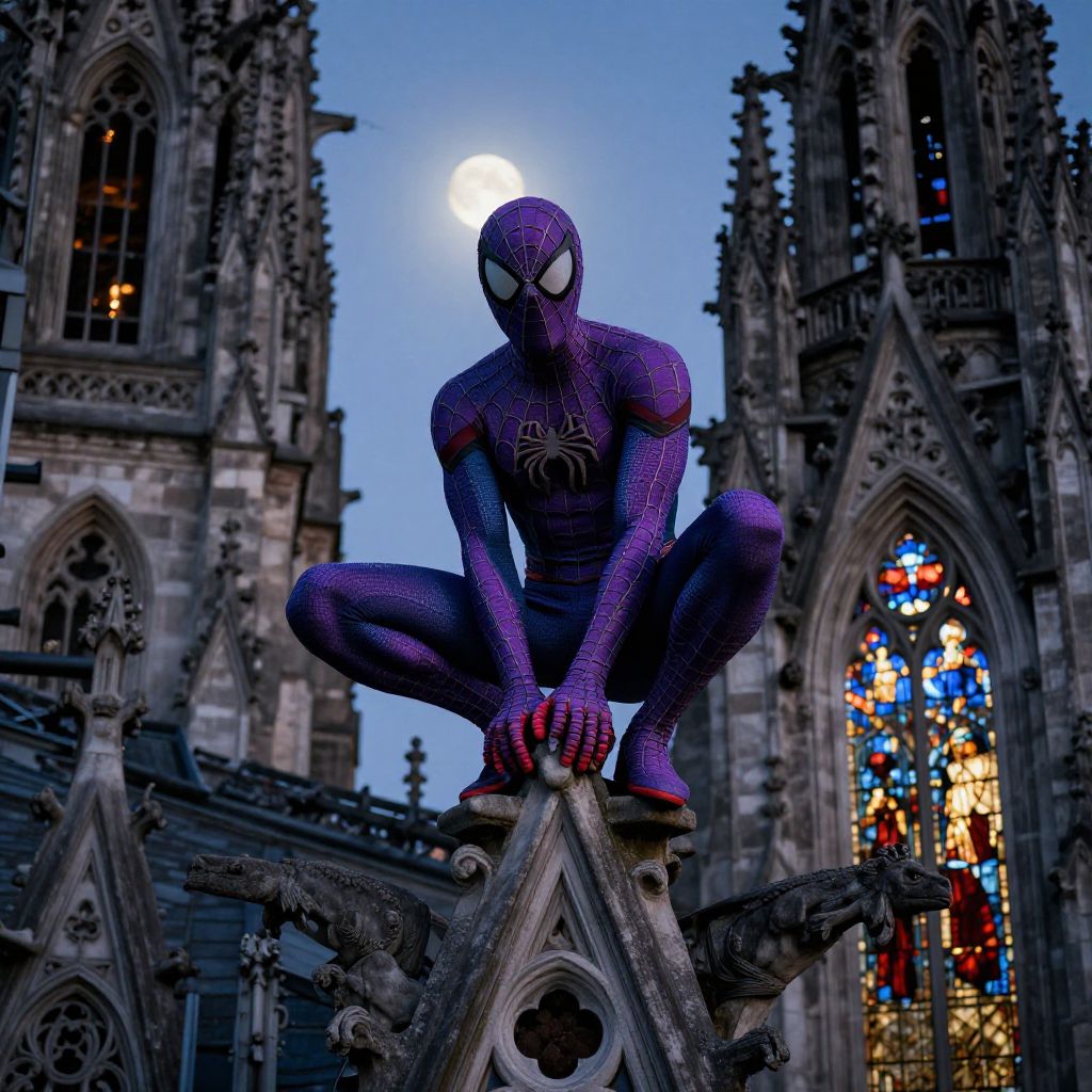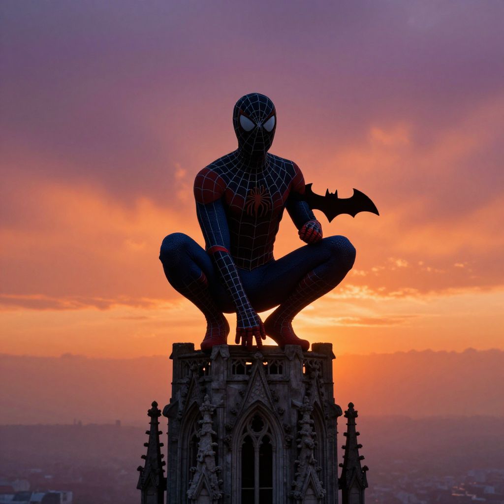 Spiderman building template showcasing a sleek skyscraper with a giant spider emblem, glowing blue and red neon lights, night city background, a blend of modern architecture and superhero themes, atmospheric lighting with reflections on glass surfaces.
