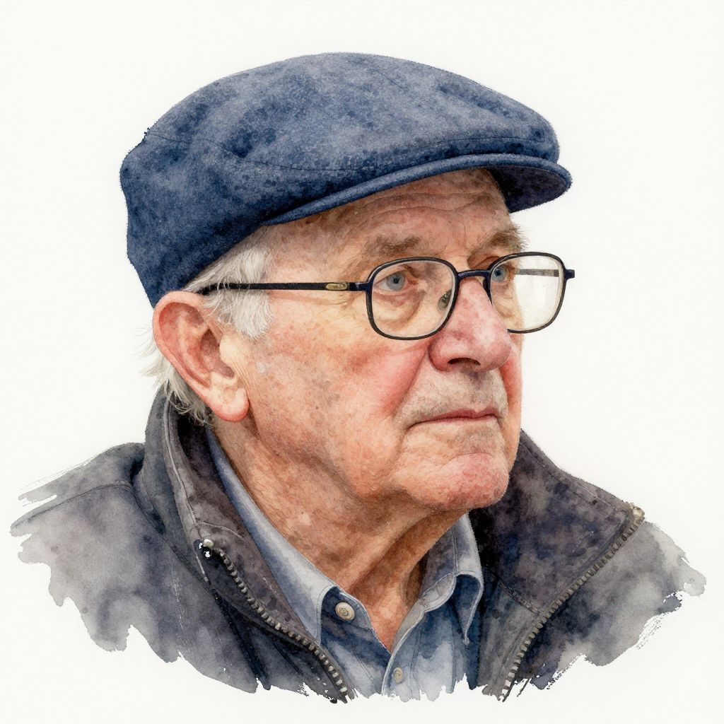 This is a detailed, digital watercolor-style portrait of an elderly white man with a fair complexion and white hair. He wears a dark blue flat cap and large, round, black-framed glasses. His expression is thoughtful, with a slight furrow in his brow. He is dressed in a dark blue jacket over a light blue shirt, with the jacket's zipper partially open. The background is completely white, making the subject stand out prominently. The texture of the watercolor medium is visible, adding a soft, slightly textured appearance to the portrait. The man’s face is prominently lit, highlighting his wrinkles and the texture of his skin.