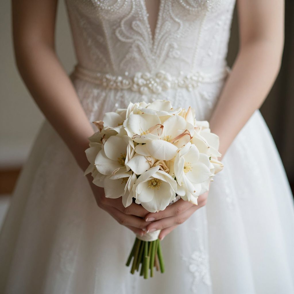 An ethereal embrace of serenity and hope, as delicate petals and tender hands cradle a bouquet that whispers the promise of new beginnings amidst the timeless elegance of a bridal gown.