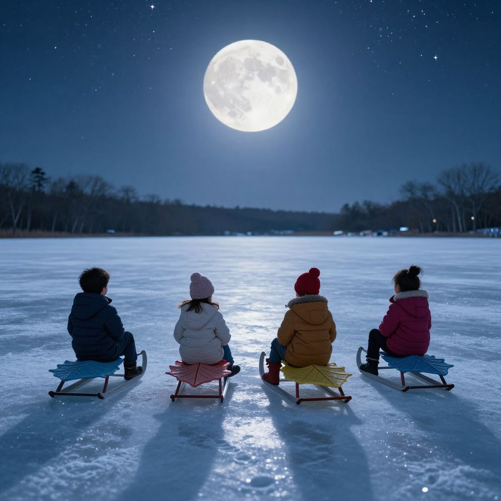 Four children sit serenely on leaf-shaped sleds gliding across a tranquil, mirror-like frozen lake bathed in the ethereal glow of a luminous full moon, their faint footprints dissolving into stardust beneath the starry night sky, rendered in a dreamy, cinematic digital art style.
