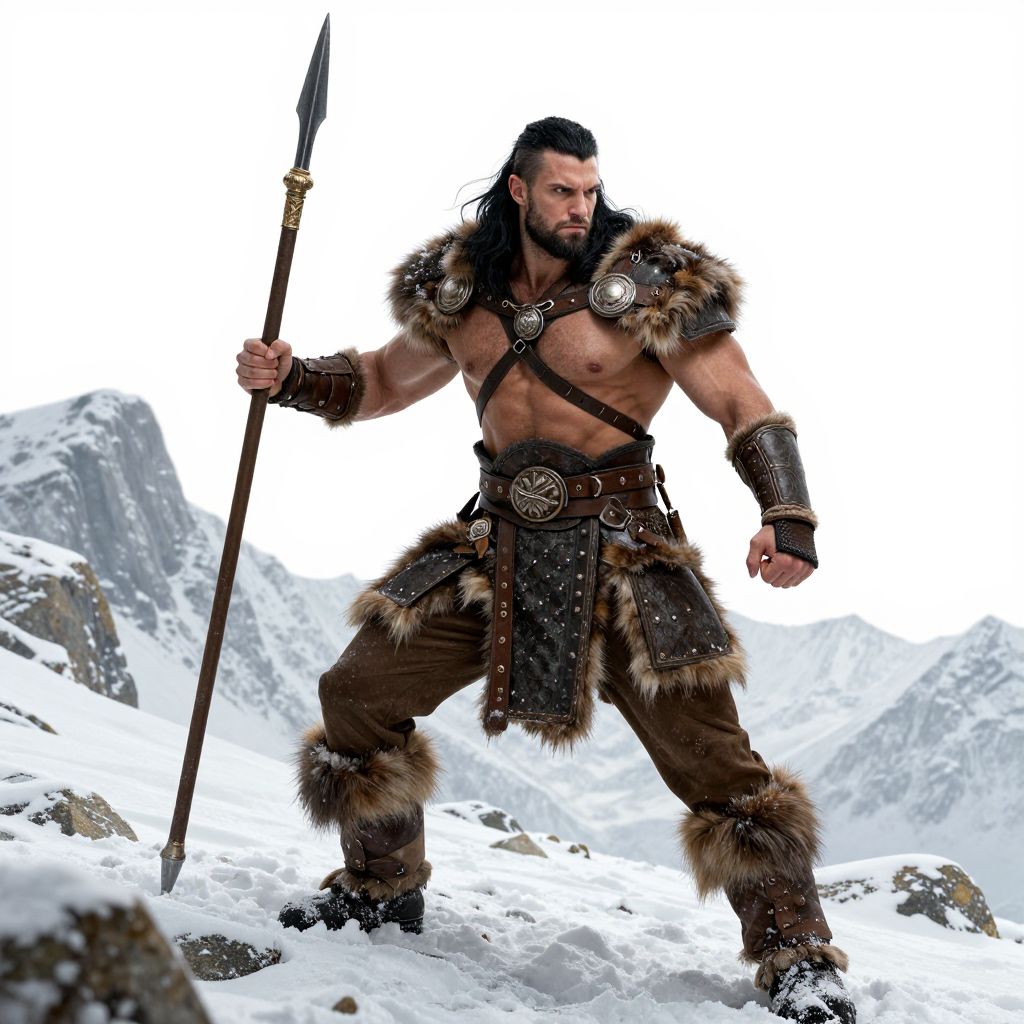 Muscular bearded warrior with long black hair, wearing fur and leather armor, holds a spear, standing on snowy mountain terrain. Digital art.