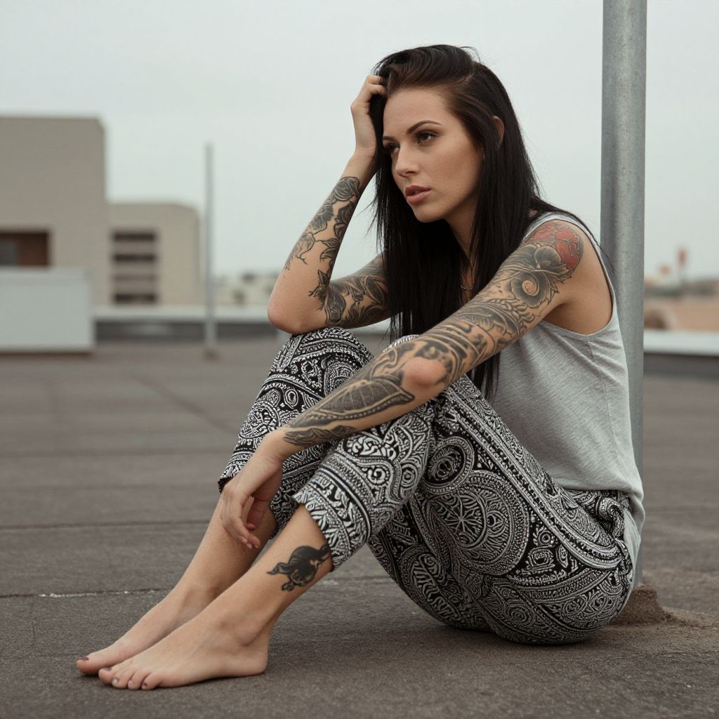 Photograph of a young woman with long black hair and a fair complexion, standing against a vivid red background. She's wearing a gray tank top that reveals extensive, colorful tattoos covering her arms and chest. She's looking down with a subtle smile, hands on her hips. Her tattoos feature intricate designs with vibrant colors. The image has a casual, edgy vibe.