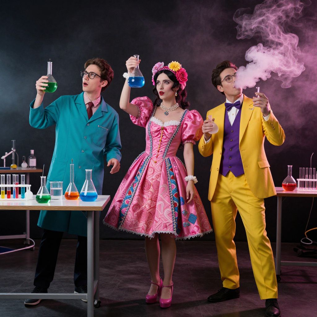 Photograph of three people in a laboratory setting. A man in a teal lab coat holds a green liquid, another in a pink, floral dress with a flower crown holds a blue liquid, and a man in a yellow suit with purple vest and white shirt exhales pink smoke. They stand in front of laboratory tables with various colorful liquids in beakers. The background is dark, enhancing the vibrant colors of their attire and the liquids. All wear glasses, adding a quirky, retro-futuristic vibe.