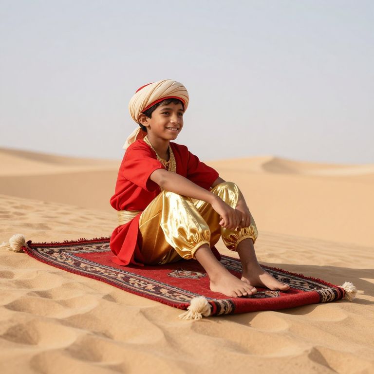 A boy dressed as Aladdin with a red shirt, gold pants, and a turban, smiling while riding a magic carpet over a sandy landscape